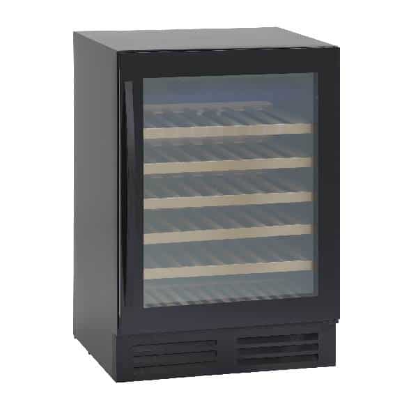 Vinkøleskab fra Scandomestic i sort design med 1 temperaturzone. Et vinkøleskab til vine, som klarer sig bedst ved samme temperatur. SV 81 B er udstyret med et buet håndtag, et kontrolpanel med digital visning, en glasdør med UV-filter for at beskytte vin